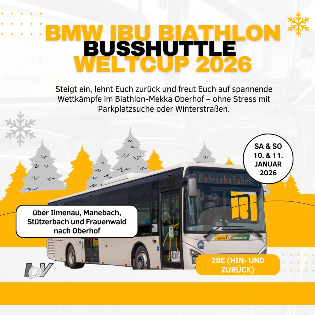 Unser Busshuttle bringt Euch am Samstag, den 101.01.2026 und Sonntag, den 11.01.2026 zum Preis von je 28,- Euro (Hin- u. Rückfahrt) ab Ilmenau nach Oberhof.