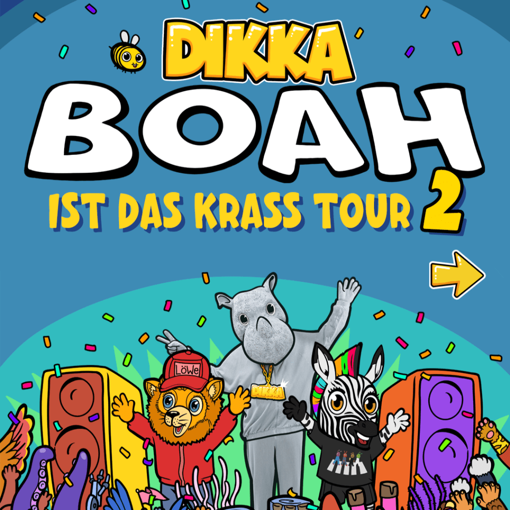 DIKKA kündigt für 2026 eine 38 Termine umfassende “BOAH IST DAS KRASS 2“-Tour durch Deutschland, Österreich und die Schweiz an. Was das heißt? Eine supercoole Reise voller Abenteuer und unvergesslicher Konzerterlebnisse – für kleine und große Gäste, für Herzklopfen und Mitsingmomente. Wir schreiben das Jahr 2020. Ein kleines Nashorn aus dem Berliner Zoo macht sich auf, die Musikwelt zu erobern. Im Gepäck: jede Menge dikke Reime und Beats – plus ein bisschen Unterstützung von einigen der größten Namen der deutschen Poplandschaft.