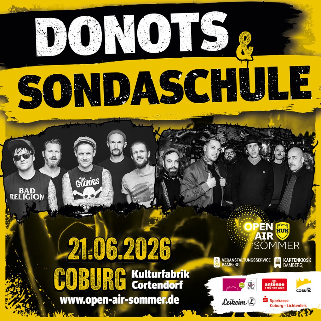 Am 21. Juni 2026 treffen zwei absolute Größen der deutschen Punk- und Ska-Szene aufeinander – und treten gemeinsam auf der Bühne in der Kulturfabrik Cortendorf auf. Donots & Sondaschule – das bedeutet maximale Energie, unerschütterliche Haltung und Songs, die direkt ins Herz (und in die Beine) gehen.