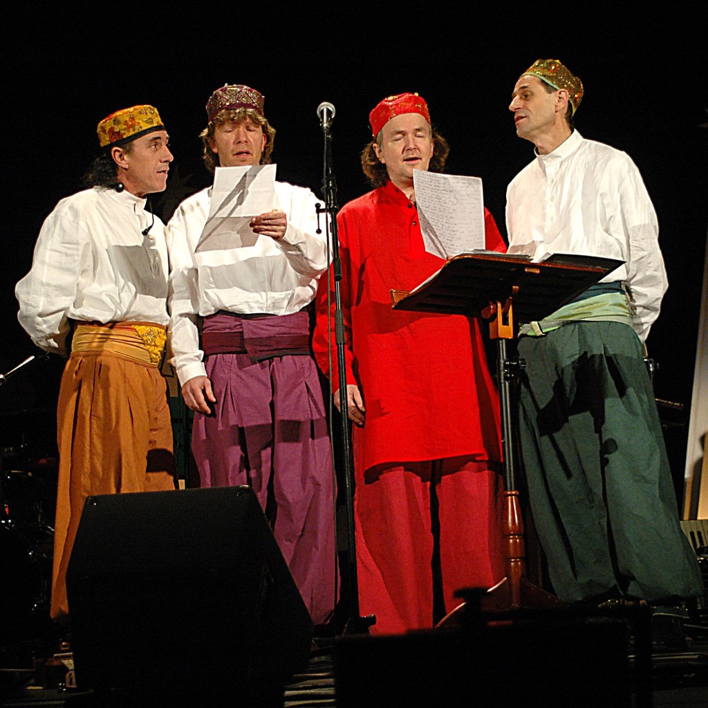 Märchenhaft orientalisch gekleidet, mit bestickten Kappen und verzierten Gürteln, weiten Hosen und Stehkragen-Hemden kommen die Musiker (die Könige) auf die Bühne.