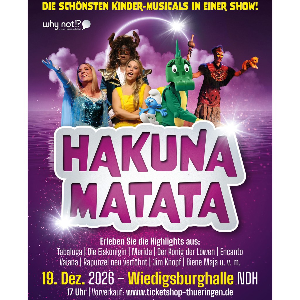 Das Kindermusical “HAKUNA MATATA“ entführt Groß und Klein auf eine zauberhafte Reise durch die Welt der bekanntesten Musicals, Disney Filme sowie beliebten Kinderfilme und Serien. Mit den großen Helden der Kindheit und mitreißenden Liedern zum Mitsingen und Tanzen wird die Show zu einem unvergesslichen Erlebnis für die ganze Familie.