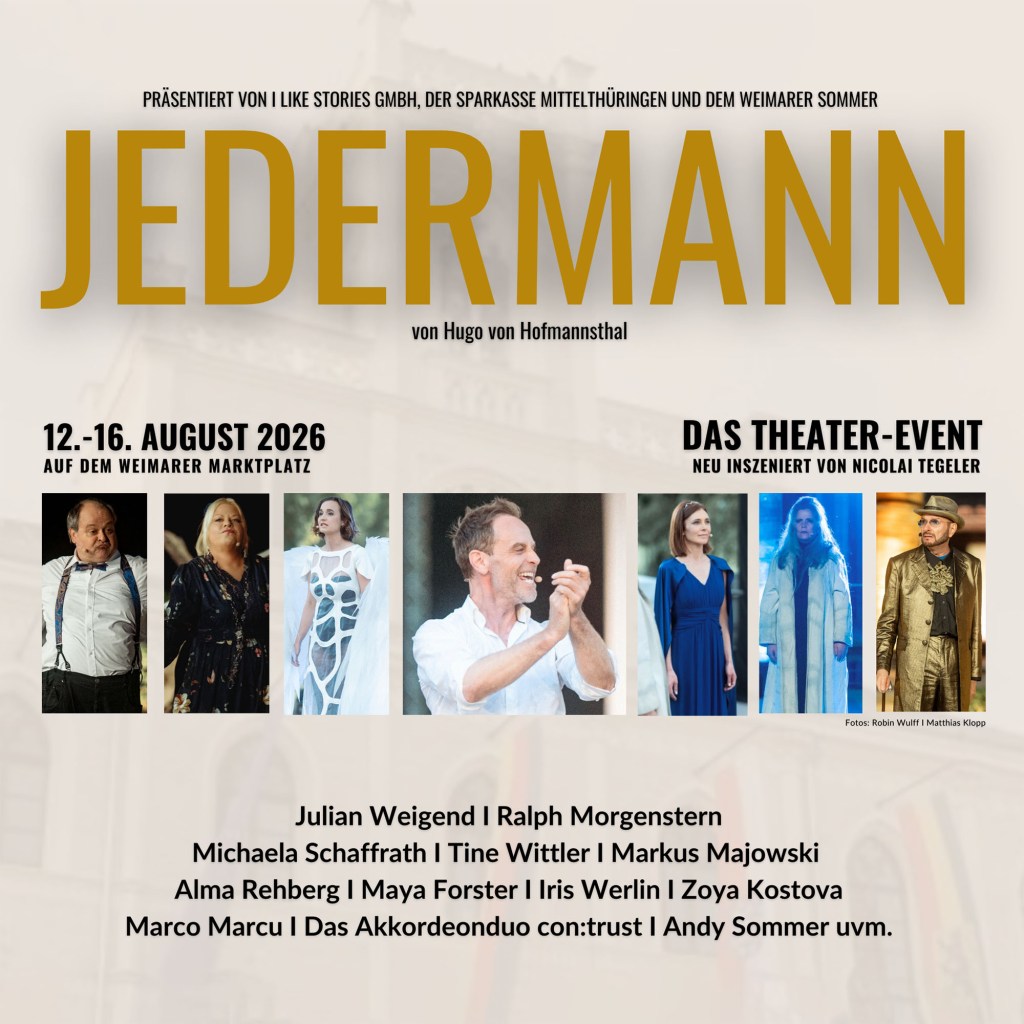 Der „Jedermann“ kehrt 2026 nach Weimar zurück – diesmal mitten ins Herz der Stadt: auf dem historischen Marktplatz, direkt vor dem Rathaus, das als eindrucksvolle Kulisse dient.