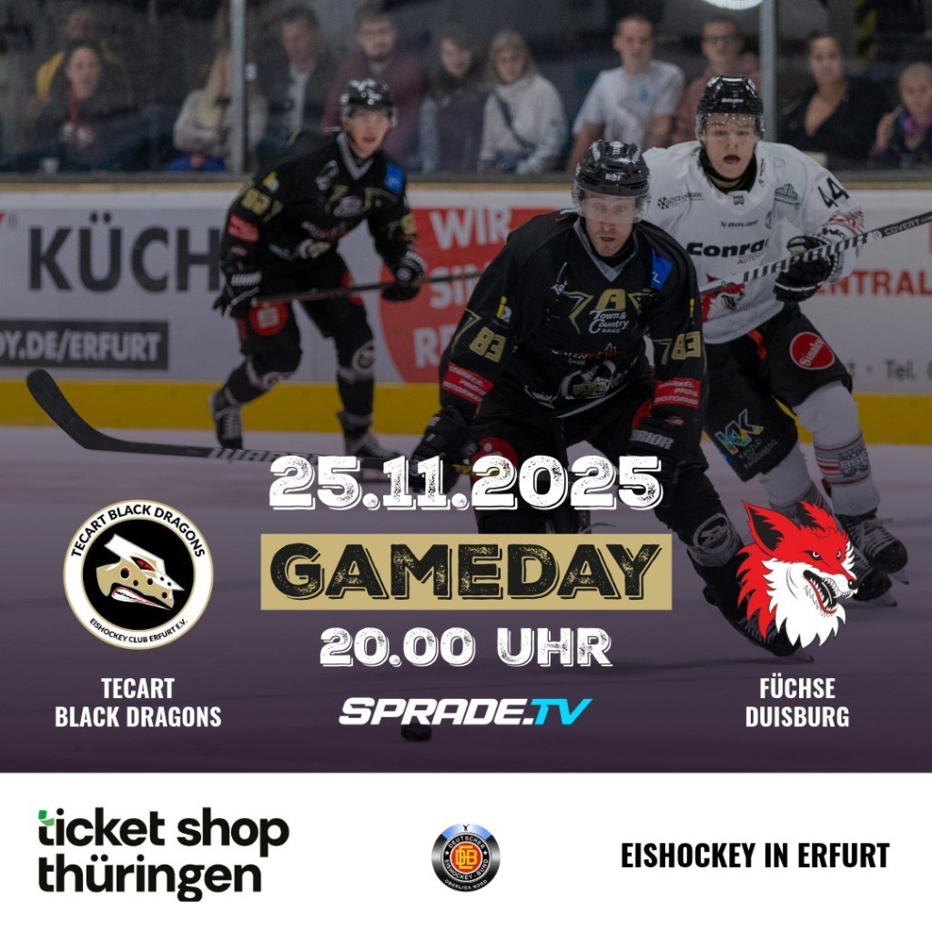 Erlebt die Faszination Eishockey live und spürt die einzigartige Atmosphäre in der Erfurter Eishalle! Wenn unsere TecArt Black Dragons auf die Füchse Duisburg treffen, ist Spannung, Leidenschaft und Teamgeist garantiert.