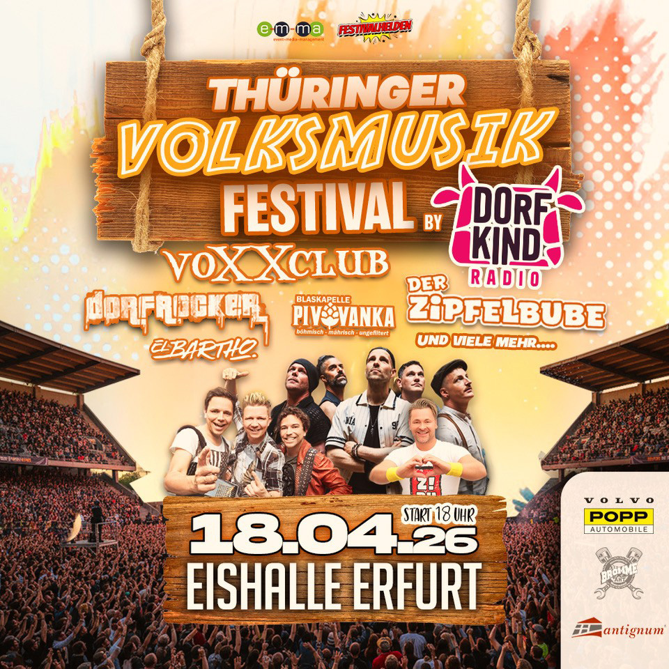 Am 18. April feiert das Thüringer Volksmusik Festival seine Premiere in der Eishalle Erfurt. Ab 18:00 Uhr erwartet die Besucher ein stimmungsvolles Live-Event, das moderne Volksmusik, Party-Sound und echtes Festival-Feeling miteinander verbindet.