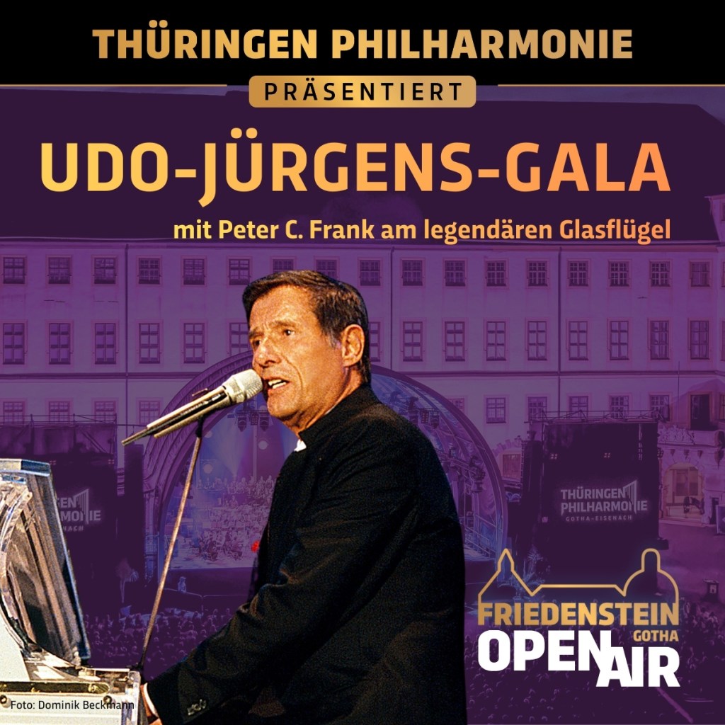 Im Rahmen des Friedenstein Open Air 2026 präsentiert die Thüringen Philharmonie Gotha-Eisenach eine ganz besondere Show – die UDO JÜRGENS-GALA mit Peter C. Frank, ein einzigartiges Erlebnis, das emotionaler kaum sein könnte. Mit seiner unverwechselbaren Stimme und begleitet von einer hochkarätigen Liveband sowie den sinfonischen Klängen der Thüringen Philharmonie interpretiert Peter C. Frank am legendären gläsernen Flügel die bekanntesten Hits und Liedschätze des großen Entertainers Udo Jürgens – mit dem unverwechselbaren Sound, den Generationen von Fans lieben. Freuen Sie sich auf Klassiker wie “Mit 66 Jahren“, “Liebe ohne Leiden“ und “Ich war noch niemals in New York“.